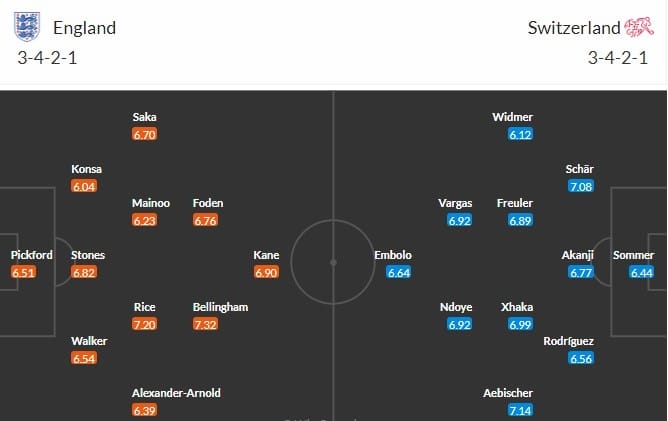Đội hình ra sân của Anh vs Thụy Sĩ trong trận Euro ngày 06/07