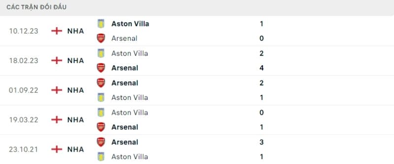 Thành tích đối đầu Arsenal vs Aston Villa