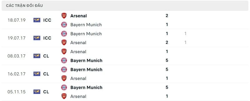 Thành tích đối đầu Arsenal vs Bayern Munich