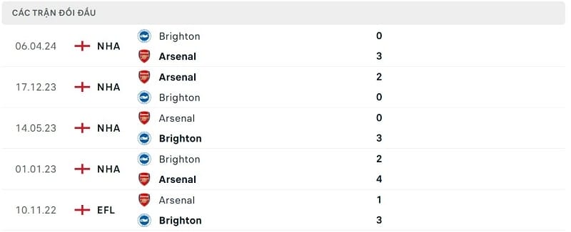 Kết quả đối đầu các trận gần đây nhất của Arsenal vs Brighton