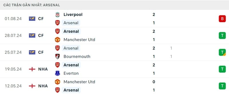 Arsenal có phong độ tốt khi chỉ thua mỗi Liverpool ở chuyến du đấu hè tính đến lúc này. Vào giai đoạn cuối Premier League 2023/24, Arsenal thắng cả 2 trận gặp Man Utd và Everton.