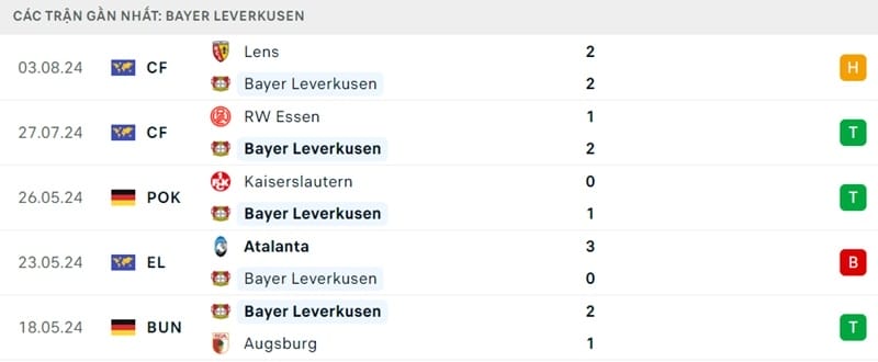 Trước 2 trận bất bại vào hè này, Leverkusen thắng 2 và thua 1 ở 3 lần ra sân cuối cùng vào mùa giải 2023/24. Họ thua Atalanta, dẫn đến việc mất chức vô địch Europa League, trước khi giành Cúp quốc gia Đức.