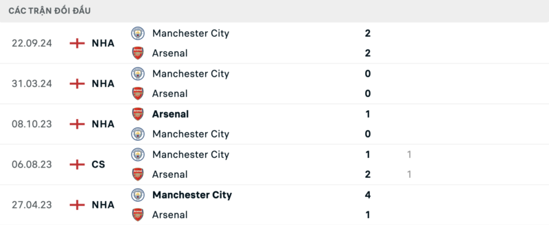 Kết quả đối đầu các trận gần đây nhất của Arsenal vs Man City