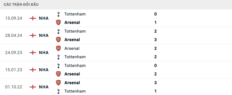 Kết quả đối đầu các trận gần đây nhất của Arsenal vs Tottenham