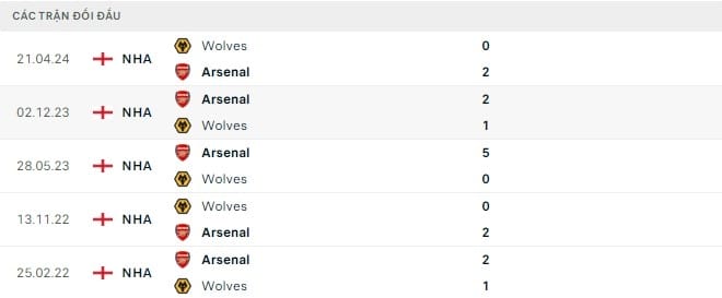 Lịch sử cho thấy Wolves là đối thủ yêu thích của Arsenal trong những mùa giải gần đây. Pháo thủ toàn thắng trong 5 lần gặp nhau gần nhất giữa 2 đội tại hạng đấu cao nhất nước Anh.