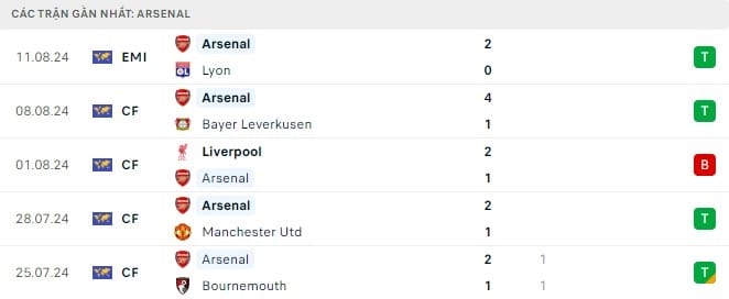 Arsenal chỉ nhận duy nhất 1 thất bại trong loạt giao hữu trước Liverpool. Nhưng khi trở về Emirates, đội chủ nhà đã chiến thắng đầy thuyết phục trước Leverkusen và Lyon. Sân nhà vẫn là điểm tựa vững vàng cho đội bóng Bắc London.