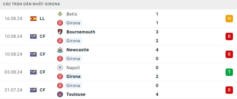 Ở trận khai màn La Liga 2024/25, Girona đã hành quân đến làm khách trên sân nhà của Betis. Đoàn quân của HLV Michel nhanh chóng bị thủng lưới bởi pha lập công của Bartra ở phút thứ 6. Tuy nhiên, Misehouy đã kịp thời tỏa sáng để giúp Girona ra về với 1 điểm trong tay. Họ kỳ vọng sẽ tiếp tục có điểm trong cuộc chạm trán Atletico Madrid.