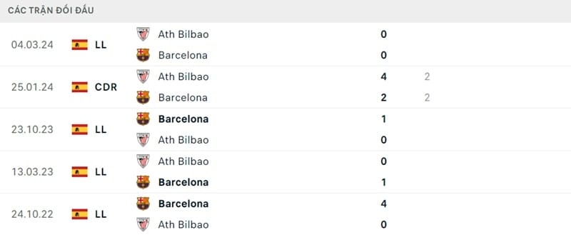 Kết quả đối đầu các trận gần đây nhất của Barca vs Athletic Bilbao