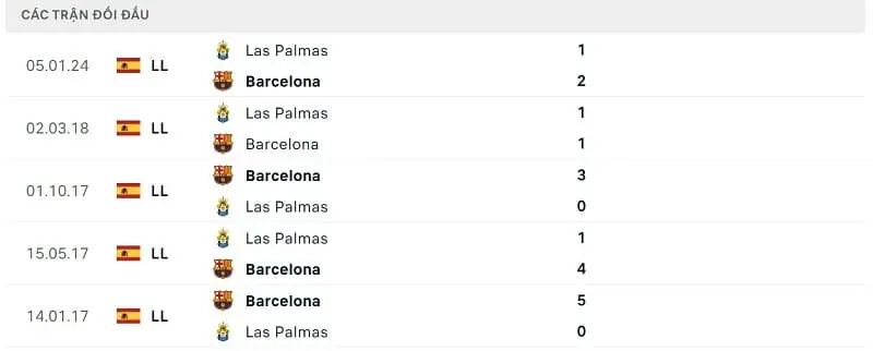 Thành tích đối đầu Barca vs Las Palmas