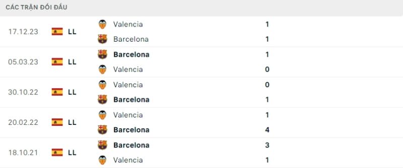Lịch sử đang nghiêng hoàn toàn về đoàn quân của huấn luyện viên Xavi. Thống kê ở 20 lần đụng độ vừa qua cho thấy, câu lạc bộ Barcelona đã giành tới 11 chiến thắng, cùng 6 lần chia điểm. Trong khi, Valencia chỉ có 3 lần tạo ra bất ngờ. Lần gần nhất, Valencia có được thắng lợi là vào năm 2020 trên sân nhà. Còn nếu tính chiến thắng của đội khách tại sân nhà của Barcelona, thì cũng đã cách đây 5 năm.