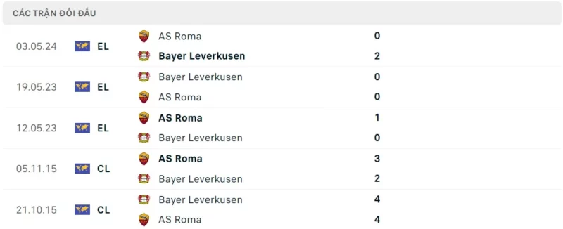 Thành tích đối đầu Bayer Leverkusen vs AS Roma