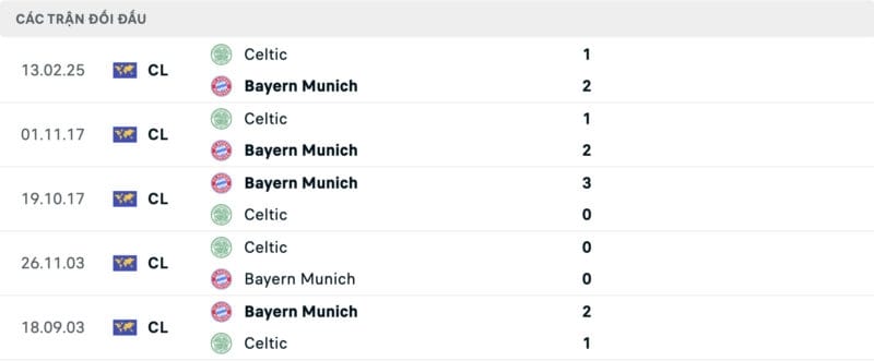 Thành tích đối đầu nghiêng hoàn toàn về phía Bayern Munich. Họ bất bại 5 lần gần nhất chạm trán Celtic, trong đó có 4 chiến thắng.