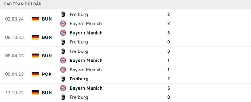 5 lần đụng độ gần nhất tại Bundesliga, không ngạc nhiên khi Bayern áp đảo với 4 chiến thắng và 1 hòa. 5-0 tại Allianz Arena vào mùa giải 2022/23 là chiến thắng đậm nhất Die Roten tạo ra trước Freiburg ở giai đoạn này.