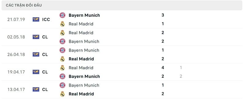 Thành tích đối đầu Bayern Munich vs Real Madrid