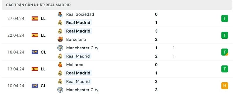 Sau đó, đoàn quân của HLV Carlo Ancelotti còn giành thêm 2 chiến thắng trước Barcelona và Real Sociedad để tiến gần đến chức vô địch La Liga 2023/24. Real Madrid hiện có tổng cộng 84 điểm, hơn đội xếp sau là Girona đến 13 điểm. Los Blancos cũng đang có phong độ cực kỳ ấn tượng với chuỗi 18 trận bất bại liên tiếp trên mọi đấu trường (13 thắng, 5 hòa).