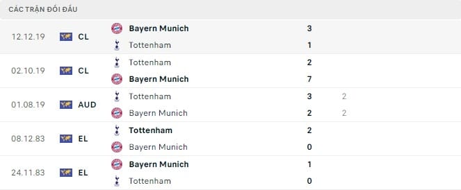 Kết quả các trận đối đầu gần đây nhất giữa Bayern Munich vs Tottenham