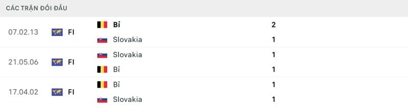 Kết quả đối đầu các trận gần đây nhất của Bỉ vs Slovakia