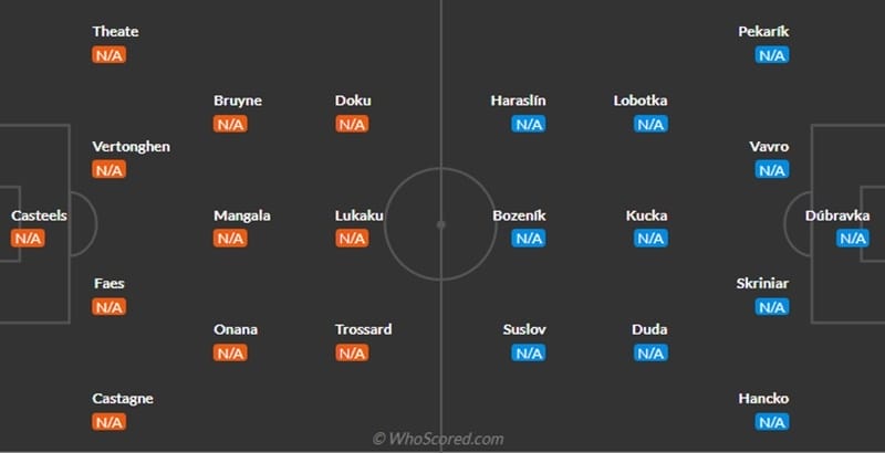- Bỉ: Casteels; Faes, Vertonghen, Theate; Castagne, Mangala, Onana, Doku; Trossard, De Bruyne; Lukaku.