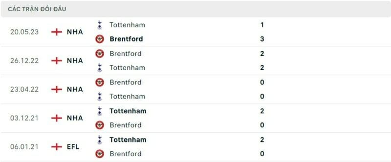 Thành tích đối đầu Brentford vs Tottenham: