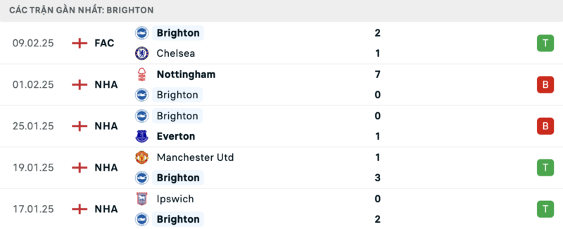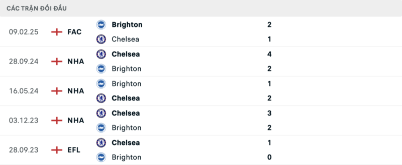 Kết quả đối đầu các trận gần đây nhất của Brighton vs Chelsea