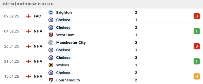 Chelsea chỉ thắng 2 trong 5 trận đã qua, gần nhất là thất bại trước Brighton tại FA Cup. Tại Ngoại hạng Anh, họ thậm chí chỉ thắng 2 trong 8 trận gần nhất.