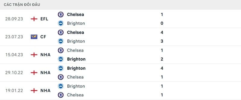 Thành tích đối đầu Chelsea vs Brighton: