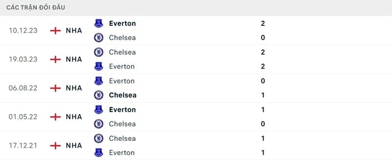 Thành tích đối đầu Chelsea vs Everton