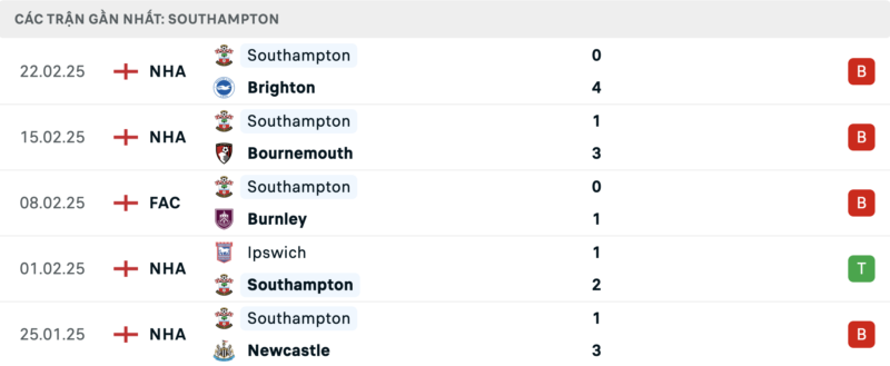 Southampton chỉ thắng được 1 trong 7 trận gần nhất trên mọi đấu trường. Tại Ngoại hạng Anh, họ thậm chí mới chỉ thắng vỏn vẹn 2 trận từ đầu mùa.