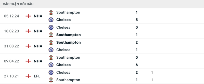 Kết quả đối đầu các trận gần đây nhất của Chelsea vs Southampton