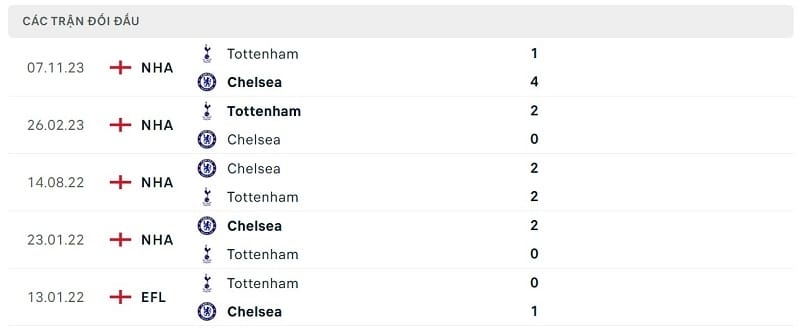 Thành tích đối đầu Chelsea vs Tottenham