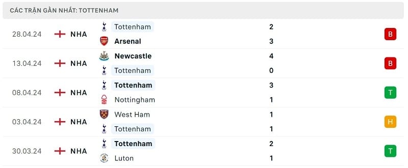 Phong độ gần đây Chelsea vs Tottenham
