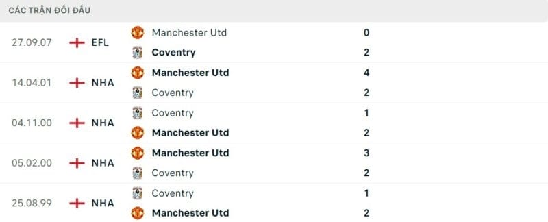 Thành tích đối đầu Coventry vs Man United