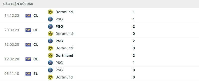 Thành tích đối đầu Dortmund vs PSG