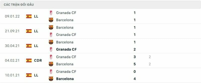 Thành tích đối đầu Granada vs Barca