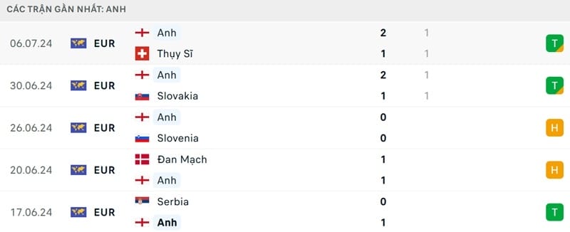 Sau 7 trận gần nhất, Anh thắng 4, hòa 2 và thua 1 khi tính 90 phút. 2/4 chiến thắng được phân định trong hiệp phụ gặp Slovakia thuộc vòng 1/8 và loạt penalty đối đầu Thụy Sĩ ở tứ kết.