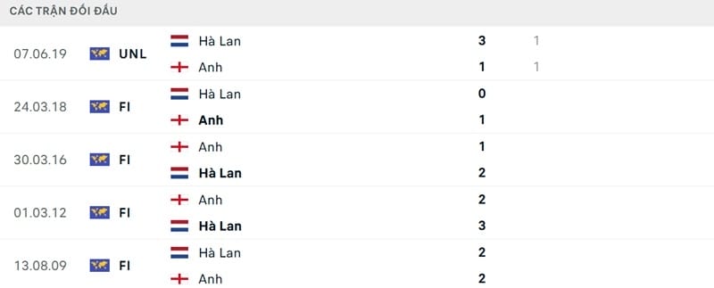 Kết quả đối đầu các trận gần đây nhất của Hà Lan vs Anh
