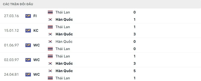 Thành tích đối đầu Hàn Quốc vs Thái Lan