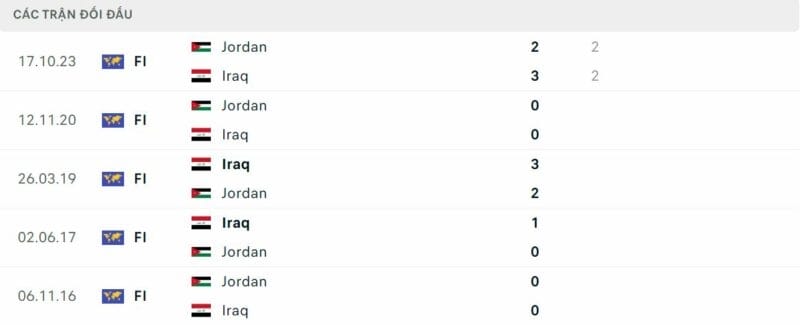 Thành tích đối đầu Iraq vs Jordan: