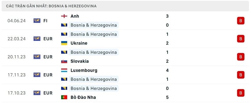 Phía bên kia chiến tuyến, loạt trận giao hữu giai đoạn này không có nhiều ý nghĩa đối với ĐT Bosnia vì họ không giành được quyền tham dự VCK Euro 2024. Ở trận đấu vừa qua gặp ĐT Anh, đoàn quân của HLV Sergej Barbarez cho thấy rõ sự chênh lệch về mặt trình độ khi nhận thất bại với tỷ số 0-3.