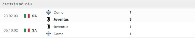 Juventus và Como chỉ có 2 lần chạm trán trong lịch sử, và đã cách đây hơn 2 thập kỷ. Đó là những trận đấu tại Serie A mùa giải 2002/03, với 1 chiến thắng cho Juventus và 1 trận hòa.