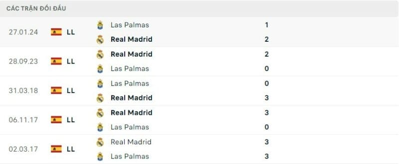 Kết quả các trận đối đầu gần đây Las Palmas vs Real Madrid