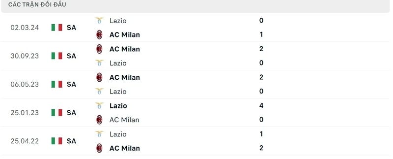 Kết quả đối đầu các trận gần đây nhất của Lazio vs AC Milan
