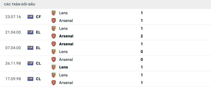 Thành tích đối đầu Lens vs Arsenal