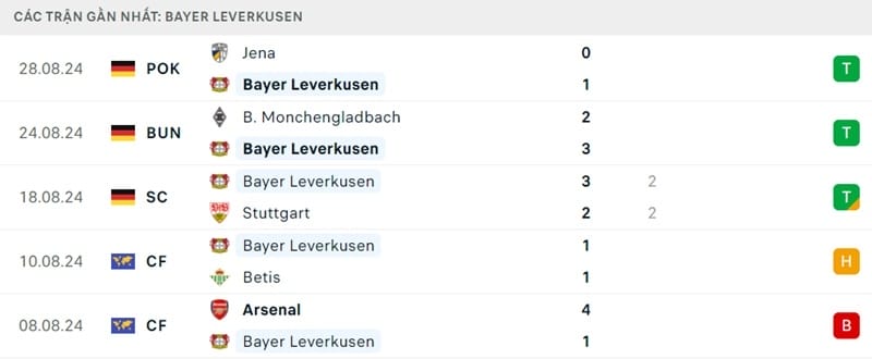 Thầy trò Xabi Alonso khởi đầu thuận lợi sau khi có 3 chiến thắng vừa qua. Ẵm Siêu cúp Đức nhờ đánh bại Stuttgart trên loạt penalty, Leverkusen vượt qua Borussia Monchengladbach 3-2 ở vòng 1 Bundesliga 2024/25, trước khi loại Carl Zeiss Jena với tỷ số 1-0 để lọt vào vòng 2 Cúp quốc gia Đức.
