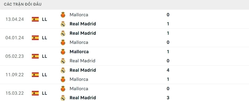 Kết quả đối đầu các trận gần đây nhất của Mallorca vs Real Madrid