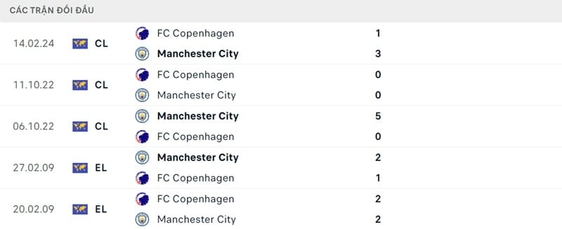 Thành tích đối đầu Man City vs Copenhagen: