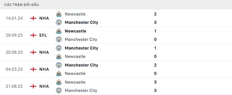 Thông tin đối đầu Man City vs Newcastle