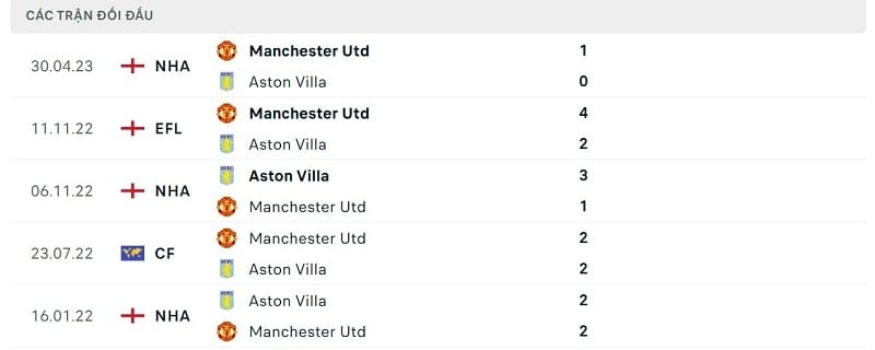 Thành tích đối đầu Man United vs Aston Villa: