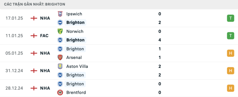 Brighton đang sở hữu chuỗi 6 trận bất bại trên mọi đấu trường. Sau những trận hòa liên tiếp, Mòng biển đã tìm lại niềm vui khi toàn thắng cả 2 trận gần nhất tại FA Cup và Ngoại hạng Anh.