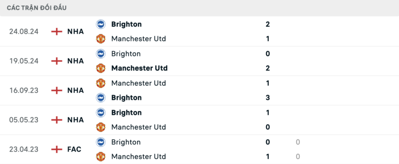 Kết quả đối đầu các trận gần đây nhất của Man United vs Brighton